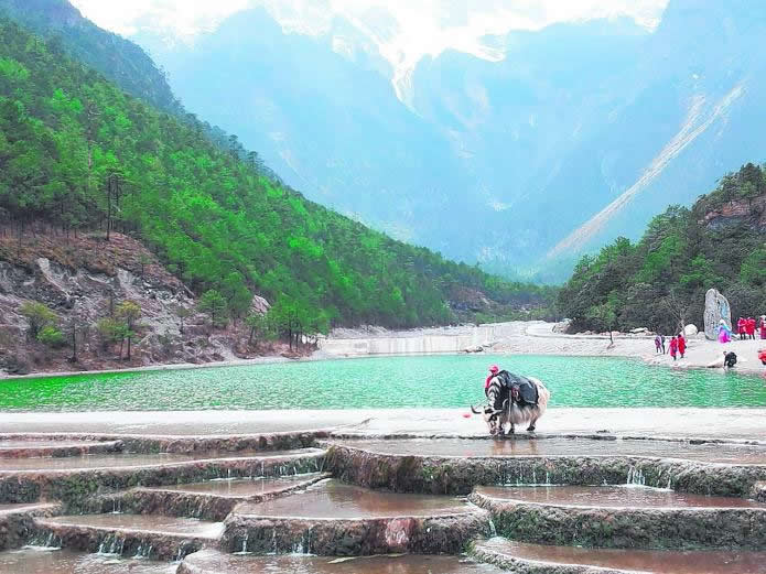 蓝月谷,其前身为早前人们所熟知的“白水河”。在晴天时,水的颜色是蓝色的,而且山谷呈月牙形,远看就像一轮蓝色的月亮镶嵌在玉龙雪山脚下,所以名叫蓝月谷。而白水河这个名字是因为湖底的泥巴是白色的,下雨时水会变成白色,所以又叫白水河。
