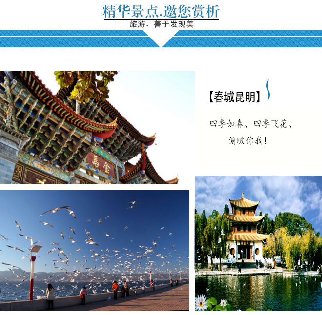 在彩云之南,每一次不同的相遇都是一段美好的旅行,旅行从昆明国旅开始!☆安心的服务  昆明国旅产品品质保证,正规操作,游客无后顾之忧!☆专业的操作  全程指定购物店,行程透明,绝无强够;充足的自由活动时间可以享受当地的美食和美景。☆精......